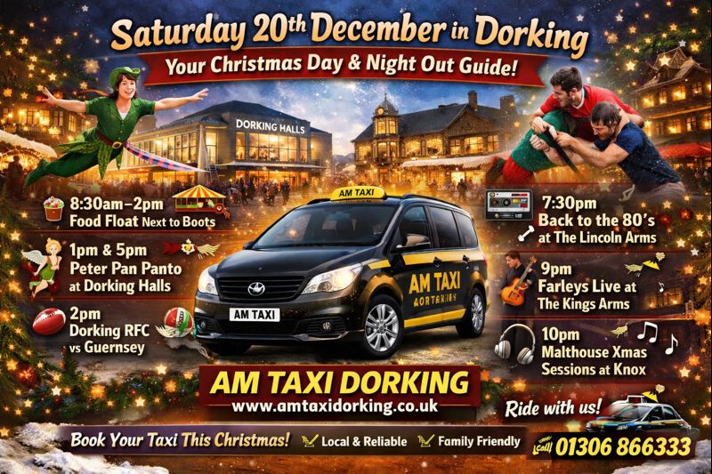 Christmas week in Dorking is packed with festive fun, live entertainment, family shows, sports, and buzzing nightlife. If you’re planning to enjoy Saturday 20th December, here’s your full local guide—plus how AM Taxi Dorking can get you there safely, comfortably, and on time ✨.